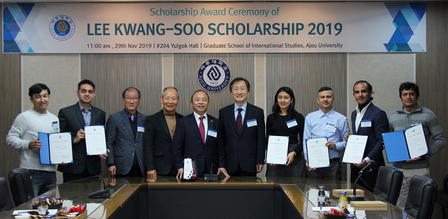 올해 이광수 장학생으로 총 7명(국제대학원 외국인 학생 6명·일반대학원 외국인 학생 1명)에게 장학금 혜택이 주어졌다. 이광수 장학증서 수여식은 지난 29일 율곡관에서 이광수 기부자와 장학생, 김병관 원장, 대학 관계자들이 참석한 가운데 진행됐다. 장학생으로 선정된 7명에게는 장학 증서가 수여됐다. 이광수 기부자(세무법인 우리 대표 세무사)는 우리 학교 경영대학원 최고위과정 29기 졸업생으로, 지난 2014년부터 총 3,000만원의 장학금을 약정해 ‘이광수 장학금’으로 우리 학교에 재학 중인 외국인 유학생들의 학업을 지원하고 있다.이광수 기부자는 "가족의 품을 떠나 꿈을 찾아 한국을 찾은 외국인 유학생들이 현실적인 어려움에 부딪칠 때가 많을 것이라고 생각한다"며 "평소 외국인 유학생들이 민간 차원의 교류를 통해 한국의 정을 느끼고 한국으로 유학을 오게 된 목적을 꼭 달성할 수 있기를 희망하는 마음에서 외국인 유학생을 위한 장학금을 기부하게 됐다"고 말했다. □ 국제대학원 수상자▲ADHIKARI BINAYA(국제경영학과, 네팔) ▲ARMAS POZO GISSELLE (국제개발협력학과, 에콰도르) ▲MAKSUD AL KALAM (국제경영학과, 방글라데시) ▲KHUSNIDDINOV NURIDDIN(국제경영학과, 우즈베키스탄) ▲SAPKOTA KUMAR(국제경영학과, 네팔) ▲HOSSAIN MD SHAHADAT (국제통상학과, 네팔)□ 일반대학원 수상자▲BASNET NAVARAJ(경영학과, 네팔)