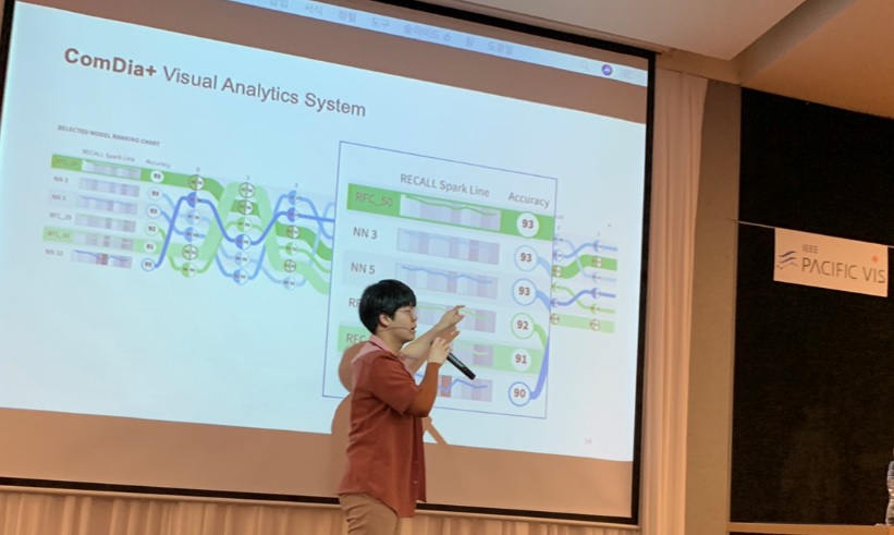 우리 학교 박찬희 학생(미디어학과)이 지난달 태국 방콕에서 열린 국제 학술대회 '퍼시픽비즈(PacificVis) 2019’에서 연구논문 2편을 발표했다.퍼시픽비즈는 전기전자기술자협회(IEEE)가 주최하는 정보시각화분야의 국제 학술대회이다. 해당 학술대회에서 학부생 신분으로 발표하고, 두 편의 논문을 한 학술대회에서 발표하는 것은 드문 일이다. 특히, 이번 성과는 우리 학교 수업에서 학생들이 수행한 과제에서 시작된 연구가 국제 학술대회까지 소개된 결과이기 때문에 의미가 깊다. 두 연구의 아이디어는 각각 미디어학과 학부 수업인 ‘데이터시각화’와 대학원 수업인 ‘정보시각화스튜디오’에서 과제로 처음 제출됐다. 수행 과제의 아이디어를 높게 평가한 이경원 교수의 권유로 학부생들은 학기가 끝난 이후에도 연구를 지속해 성과를 이룰 수 있었다.발표된 논문 두 편은 와 이다.먼저, 첫번째 논문인 는 오픈소스 소프트웨어 커뮤니티인 깃허브(GitHub)의 저장 데이터를 활용해 컴퓨터과학과 데이터과학의 기술 동향을 탐색하는 시각 분석 시스템을 제안했다. 이 연구의 초기 버전은 정보시각화 분야의 최대 규모 학술대회로 꼽히는 '인포비즈(InfoVis)2018’ 에서 포스터로 발표된 바 있다.두번째 발표된 논문 는 인공지능 분류 모델의 성능을 분석하고 약점을 개선하기 위해 시각화 시스템을 제안했다. 이 연구는 ▲다수의 모델 성능 동시 비교 ▲오분류 원인 탐색 ▲모델 상보성을 통해 새로운 모델 제안 등으로 기존 성능 분석 시스템이 가지고 있던 한계를 보안했다.박찬희 학생은 "학부 과정에서 배운 디자인과 프로그래밍, 산학협력기관을 통해 배운 실무 능력, 연구실 인턴십을 통한 연구 역량 강화가 큰 도움이 됐다"며 "앞으로 결과를 더 발전시켜 나갈 계획이다"고 말했다.