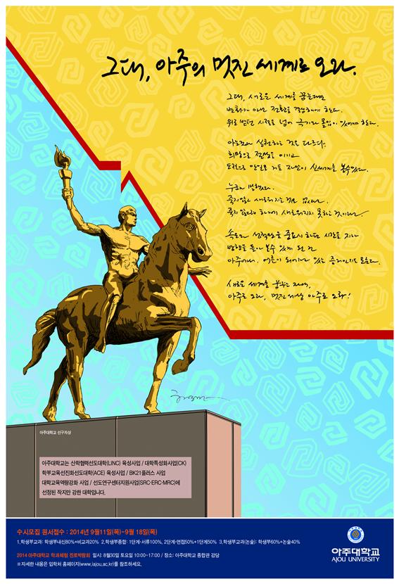 2015학년도 우리 학교 수시모집 최종경쟁률이 24.24대1을 기록했다. 입학처는 지난 18일 수시모집 원서접수를 마감한 결과 1014명 모집에 2만4579명의 지원자가 몰려 24.24대1의 경쟁률을 기록했다고 밝혔다. 지난해 수시모집 최종 경쟁률은 16.5대1로, 전년 대비 46% 상승한 결과다. 전형별로는 일반전형1(논술)의 경쟁률이 40.90대1로 가장 높았다. 올해 일반전형1(논술)의 선발인원은 지난해보다 105명 축소된 454명으로 학생부(교과) 60%와 논술고사 40%로 일괄합산하여 학생을 선발하며 수능최저학력기준이 적용된다. 학과별로는 문화콘텐츠학과가 총 5명 모집에 359명이 지원하여 71.80대 1의 가장 높은 경쟁률을 보였고, 의학과는 총 8명 모집에 528명이 지원해 66대1의 경쟁률을 기록했다. 일반전형1(논술)의 자연계열은 평균 38.33대1, 인문계열은 평균 47.89대1의 경쟁률을 보였으며, 전체 일반전형1(논술)의 경쟁률은 전년도에 비해 62% 상승했다. 올 해 신설된 국방IT우수인재전형(국방디지털융합학과)의 경우 10명 모집에 134명이 지원하여 13.4대 1의 경쟁률을 기록했다. 이 전형은 1단계에서 서류평가 100%로 모집인원의 3배수를 선발하며 2단계에서는 1단계 서류평가(50%)와 면접(50%), 적격성 여부를 판별하는 공군본부주관항목을 거쳐 최종 합격자를 선발한다. 수능최저학력기준은 적용하지 않는다. 또한 과학우수인재전형의 경우 48명 모집에 316명이 지원하여 6.58대1의 경쟁률을 보였으며, 아주ACE전형(고른기회)의 경우 59명 모집에 768명이 지원하여 13.02대1의 경쟁률을 기록하였다. 그밖에도 학생부교과전형인 학교생활우수자전형은 7.56대1, 학생부 종합전형인 아주ACE전형은 13.44대1, 실기전형인 외국어특기자전형은 26.54대1의 경쟁률을 나타냈다. 한호 입학처장은 “올해 수시 선발인원이 축소되었으나 지원자는 전년도보다 크게 증가하여 전반적인 경쟁률이 많이 상승했다”며 특히 “인문계열의 문화콘텐츠학과와 심리학과, 자연계열의 화학공학과와 기계공학과, 그리고 의학과의 경쟁률이 높았다”고 말했다. 2015학년도 논술고사는 11월22일(자연계열/금융공학과)과 11월23일(인문계열) 이틀에 걸쳐 실시한다. 수능최저학력기준이 적용되지 않는 전형(아주ACE전형, 과학우수인재전형, 외국어특기자전형, 체육우수인재전형, 특수교육대상자특별전형)의 경우 11월7일에 최초 합격자를 발표할 예정이다. 수능최저학력기준이 적용되는 전형(학교생활우수자전형, 일반전형1(논술))과 국방IT우수인재전형은 12월6일에 최초합격자를 발표한다.