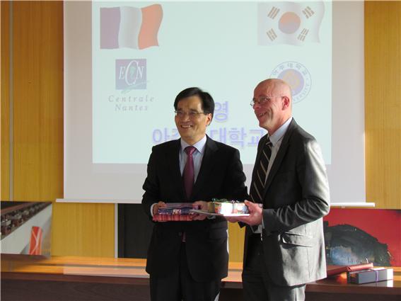 안재환 총장이 지난 2일부터 9일까지 6박7일 간의 일정으로 프랑스를 방문해 현지 대학들과 교류 협력 방안을 논의했다. 이번 방문에는 김병관 대외협력처장, 윤정용 국제협력팀 과장이 동행했다. 오수기 불어권협력지원센터장, 송봉섭 기계공학과 교수도 일부 행사에 참여했다. 안 총장은 ECE 파리(ECE Paris Graduate School of Engineering), 에꼴 센트럴 낭뜨(ECN, Ecole Centrale de Nantes), 오덴시아 낭뜨 경영학교(AUDANCIA Nantes Ecole de Management), 낭뜨 대학(University of Nantes), 파리 13대학(University of Paris) 등을 방문했다. 이번 방문을 통해 우리 학교는 ECE 파리, 에꼴 센트럴 낭뜨(ECN)와 신규 자매결연 협정을 맺었고 낭뜨 대학과는 협력확대 의향서를 체결했다. 오덴시아 낭뜨 경영학교 및 파리 13대학과는 기존의 협력 관계를 더욱 확대하는 방안에 대해 논의했다. 안재환 총장을 비롯한 우리 학교 관계자들은 낭뜨 시청을 방문, 낭뜨 시장과 면담하고 낭뜨 시 소재 대학들과의 교류 협력 방안에 대해 이야기를 나눴다. 한편 3일 저녁 에꼴 센트럴 낭뜨(ECN)에서 열린 만찬에서 안재환 총장은 아주대학교 설립 초기 양교 협력을 주도했던 이 학교 전 교수진 5명에 감사패를 전달했다. ‘한불 문화 및 기술협력에 관한 협정’에 기반을 두고 설립된 우리 학교는 과거 ECN으로부터 많은 도움을 받았다. ECN 소속 교수들은 1970년대 아주대학교에 파견되어 불어 및 전공 교육을 맡은 바 있다. 이날 만찬에는 과거 아주대학교에 체류한 경험이 있는 프랑스 교수들과 프랑스 현지에서 파불 아주대 학생들을 지도했던 교수들이 참석했다. 오상경 동문(기계 73), 권영빈 동문(전자 74), 최종욱 동문(기계 78)도 함께 자리했다. *사진설명- 에꼴 센트럴 낭뜨(ECN) 총장과 양교 기념품을 교환하고 있는 안재환 총장