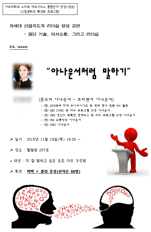 [당일공지]말을 잘 하고 싶은 아주인을 위한 현직 아나운서가 강의하는 '아나운서처럼 말하기' 강연(차세대 산업지도자 리더쉽 양성 세번째 강연)