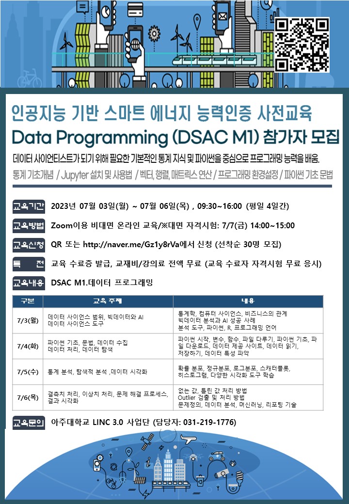 [LINC 3.0] (전액무료, 선착순) (DSAC M1 자격 과정) 인공지능 기반 스마트 에너지 능력인증 사전교육 Data Programming 참가자 모집
