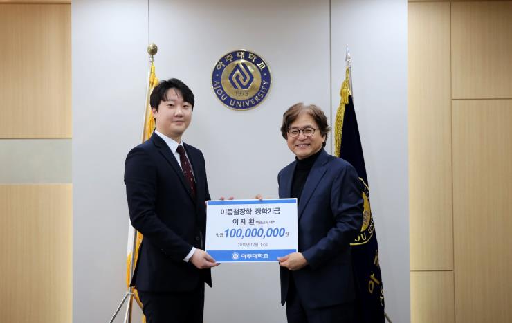 우리 대학 글로벌제약임상대학원 재학생인 이용운 ㈜셀앤바이오 대표이사가 1억원 기부를 약정했다.기부금 전달식은 15일 오전 율곡관 총장실에서 진행됐다. 이 대표는 1억원 기부를 약정하고, 5000만원을 기부했다. 이용운 대표는 이 기금이 글로벌제약임상대학원의 장학기금과 연구비로 각 2000만원, 개교50주년 기념관 건립기금으로 1000만원씩 사용되었으면 한다고 밝혔다.이 대표는 “여력이 되는 한 아주대학교를 위해 지속적으로 기부하고 싶다”고 말했다. 박형주 총장은 우리 학교를 대표해 감사의 인사를 전했다.