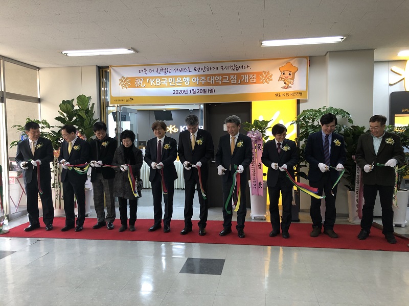 박형주 총장과 각 부서 처장단이 지난1월17일 구학생회관에서 개최된 KB국민은행 아주대점 개점식에 참여하였다.